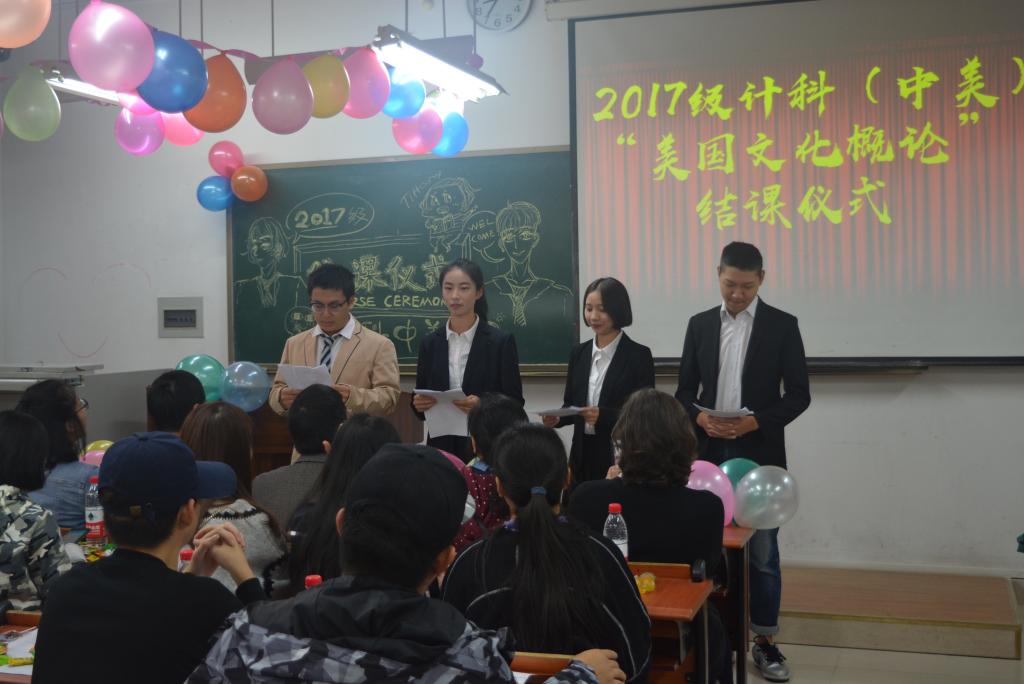 2017年10月26日星期四上午八点三十分,9728太阳集团计科中美班级在弘德楼12104教室举行了“美国文化概论课”结课仪式。9728太阳集团院长魏延、副院长李世宏、国际处主任周春励、2017级辅导员傅帆、鲍尔州立大学教师Tiffany出席本次仪式。本次仪式由中美的夏五洋(Wade)、苏燕妮(Sofia)、吴小冬(Arvin)、刘漫(Zorro)主持。