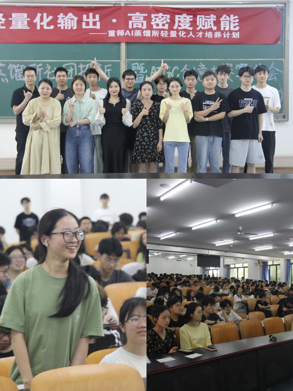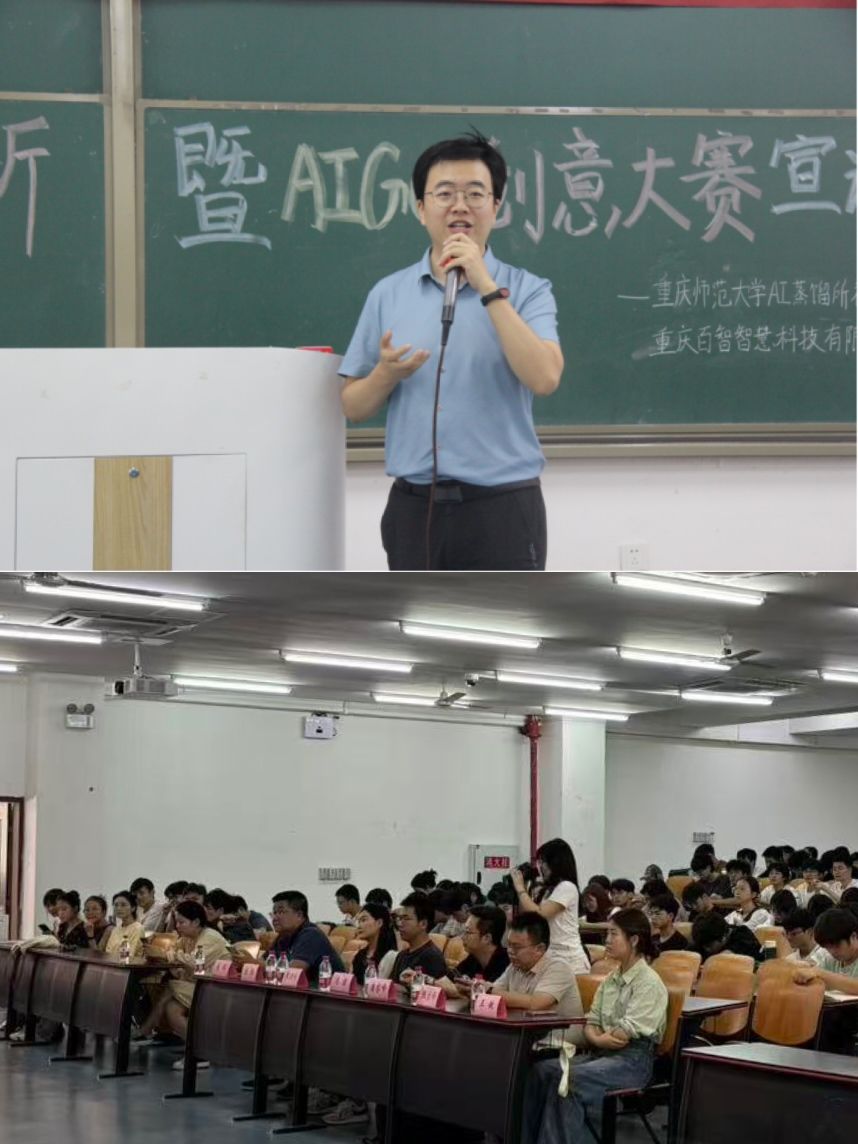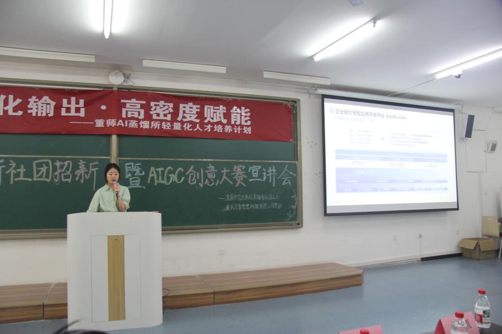 2025年5月29日,9728太阳集团在砺志楼T2113教室举办了“AI蒸馏所重师站招新暨AIGC创意大赛宣讲会”。活动由太阳集团官网tyc9728“AI蒸馏所”主办,重庆百智智慧科技有限公司支持。出席本次活动的嘉宾有9728太阳集团副院长冯骥、计算机科学与技术系主任牛彦敏、软件工程系主任肖颗、智能科学与技术系主任张文锋;重庆百智人才教育经理潘睿峰、人才教育商务经理唐杨,技术研发中心技术专家张世林、产品专家王敏、AI蒸馏所负责人王敏。学院三百余名大一学生参加了本次活动,活动由刘维炜同学主持。