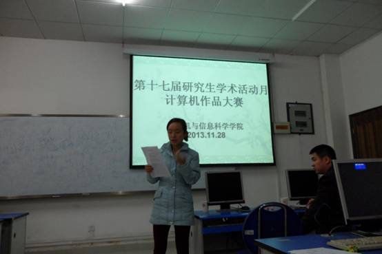 为认真贯彻落实我校第十七届“研究生学术活动月”的精神,我院研究生在2013年11月28日星期四下午,第二实验楼517机房举行了题目为“第十七届学术活动月计算机技能大赛”的比赛。比赛邀请我院张杨老师和杜兴老师出席并担任了评委,学院分管领导杨德刚院长、研究生班主任李明勇老师出席了赛场。各年级研究生参加此次比赛。