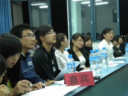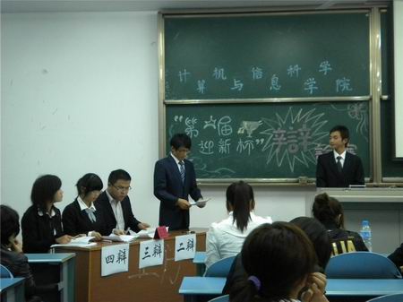 在5302教室担任辩论赛的评委有我院团总支学生书记孙柳艳、办公室主任赵越、通讯部部长冯李磊、文娱部部长杜莎莎以及优秀主持人王雪梅。组织部部长于洲担任了本赛场的主席,校新闻中心广播部部长戚宏涛作为嘉宾应邀参加了本次比赛。