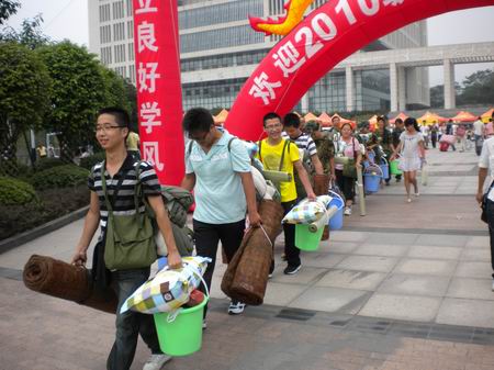 志愿者首先在新生下车点将我院新生接到大本营,将其家长带到休息处,为其送水和扇子,让他们静心等待新生报到完毕归来。然后顶着烈日陪同新生走完所有的报到程序,并帮助他们将领到的物资搬回所属寝室。最后目送新生上到前往军训地点的车上。团总支副书记张敬和所有学生干部则坚守在大本营,及时准确地为新生传达信息和解决疑惑。炎炎烈日无法停止一个个身影的穿梭,汗流浃背亦阻挡不了一张张笑脸的绽放。我院迎新组织工作的细致严谨,井然有序的现场秩序和良好的服务态度给新生留下了深刻的印象,截止9月12日晚10:00,我院共迎接新生419人,到部队参加军训418人。