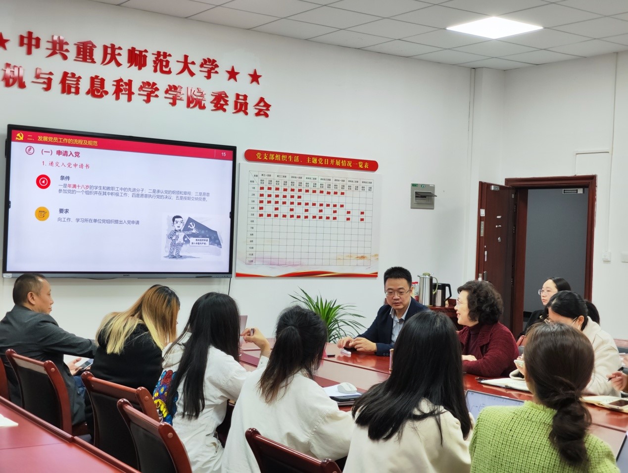 为进一步贯彻党的二十大精神,落实新时代党的建设总要求,加强基层党建工作,推进党务工作标准化规范化建设1027日,院党委邀请了初等教育学院党委副书记郭小辉来学院开展“发展党员工作规范化建设”的党建专题讲座。讲座由学院党委书记陈兰主持,党委专职组织员、学院八个支部的书记及支部委员、学生会马列部的党员同志聆听讲座。