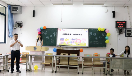 活动伊始,学院党委书记王军讲话,热烈欢迎大朋友小朋友齐聚一堂,共度亲子美好时光。在“认识新朋友”环节,小朋友们依次上台进行自我介绍,稚嫩的声音中透露出自信与期待。孩子们迅速拉近距离,现场掌声与笑声交织,为后续活动奠定了温馨的基调。为充分调动孩子们的积极性,志愿者团队带领全体小朋友开展“动物模仿操”热身运动。伴随着《动物模仿操》的旋律,孩子们化身小兔子、小青蛙、长颈鹿,蹦跳、伸展、摇摆,动作憨态可掬。大家一起挥舞双手,感受运动带来的快乐,一张张纯真的脸上洋溢着幸福的笑容。家长纷纷举起手机记录这充满童趣的一幕。