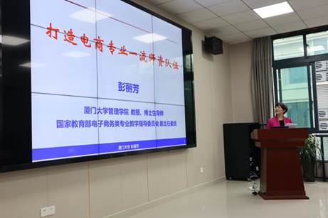 教育部高等学校电子商务类专业教学指导委员会副主任委员、厦门大学管理学院彭丽芳教授作《国家一流电子商务专业师资队伍建设》报告。彭教授详细介绍了教育部高等教育学校电子商务类专业教学指导委员会为推进电商一流专业建设而开展的细致精心的工作,并指出未来要继续紧扣新时代高校四十条,打造具有高尚品德、教学团队、持续学习、高超的教学能力的“四有”好老师。