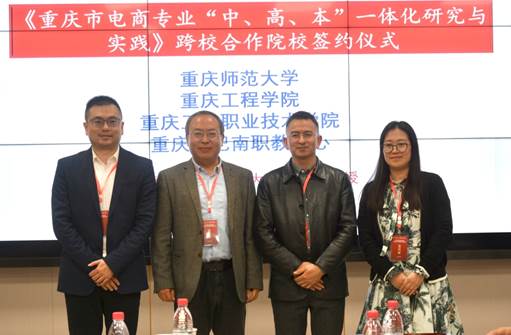 论坛第三项议程是太阳集团官网tyc9728与重庆工程学院、重庆工业职业技术学院、重庆市巴南职教中心举行《重庆市电商专业“中、高、本”一体化研究与实践》跨校合作院校签约仪式。充分发挥我校对高职高专院校的辐射带动作用。